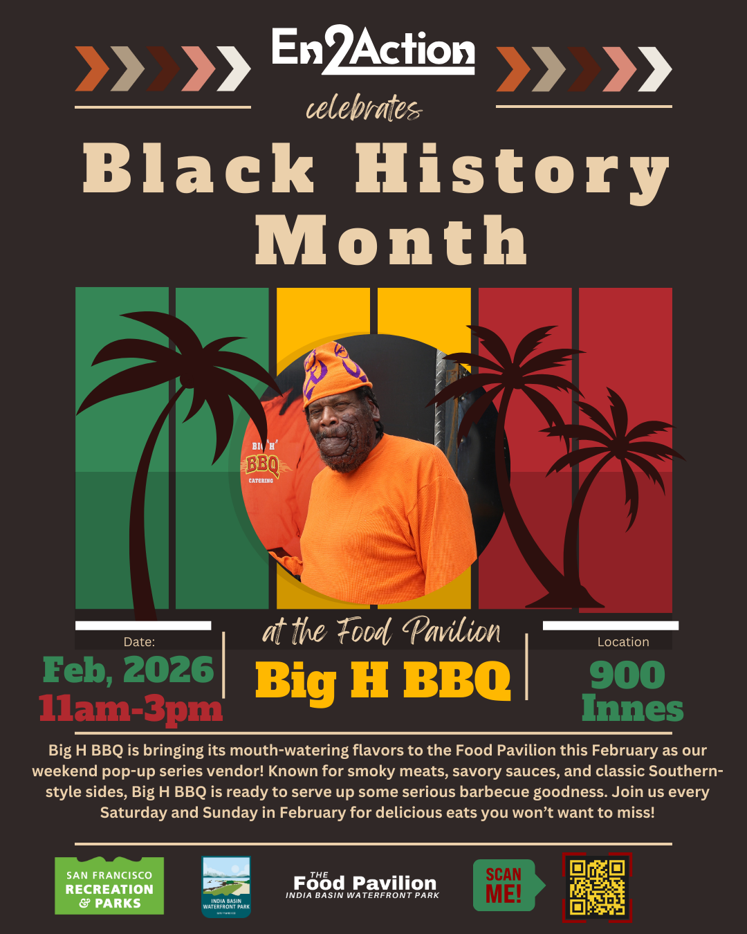 Big H BBQ takes over the pavilion in February in celebration of Black History Month. Known for smoky meats, savory sauces, and classic Southern-style sides, Big H BBQ brings bold flavors and time-honored barbecue traditions to the waterfront. Stop by on Saturdays and Sundays to enjoy hearty barbecue favorites and support a beloved local vendor. For more information, visit thefoodpavilionsf.org.