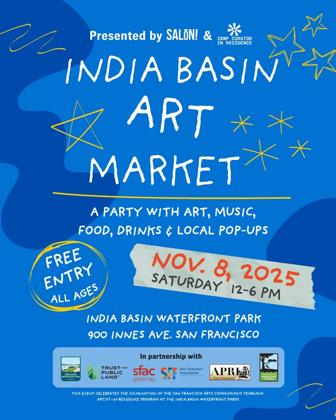 Celebrate local creativity at the India Basin Art Market on Saturday, November 8 from noon to 6 p.m. at India Basin Waterfront Park (900 Innes Avenue). Enjoy a free, all-ages afternoon of art, music, food, drinks, and local pop-ups hosted by SALÓN! and the India Basin Waterfront Park Curator-in-Residence. This event marks the culmination of the San Francisco Arts Commission’s yearlong artist-in-residence program at the park. For more information and to RSVP, click this link.