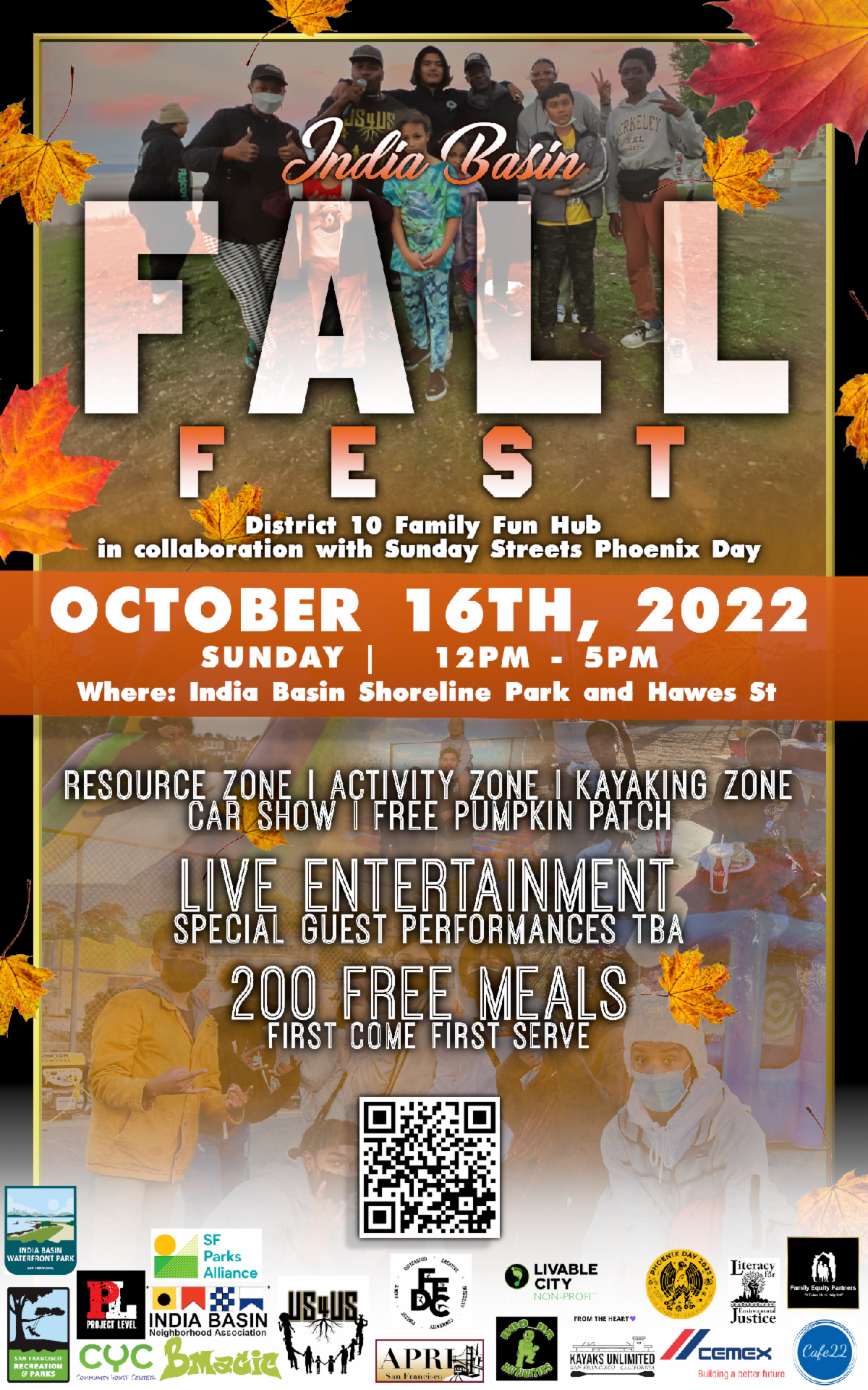 Join community partners to welcome in the new season with the India Basin Fall Festival on Sunday, October 16 from noon to 5 p.m. at India Basin Shoreline Park (Hunters Point Boulevard and Hudson Avenue). The event will feature free kayaking, car show, pumpkin patch, performances, and more. In addition, there will be 200 meals given out with first come, first served. This event is a part of Sunday Streets’ Phoenix Day. For more information, click here: https://www.sundaystreetssf.com/phoenixday/