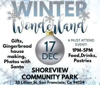 Join community partners for Shoreview Winter Wonderland on Saturday, December 17 from 1 to 5 p.m. at Shoreview Community Park (35 Lillian Street). The event, supported by the India Basin Waterfront Park Project, will feature gifts, gingerbread house making, refreshments and photos with Santa. For more information, contact the tenants association by calling Ms. Powell at (415) 370-9893 or Ms. Rollins at (415) 286-4190.