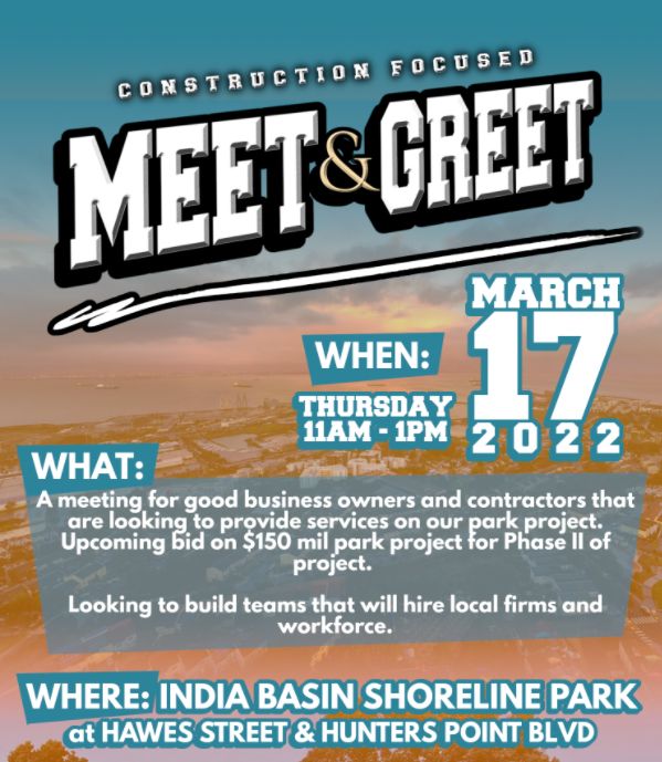 APRI will host a contractor and subcontractor meet-and-greet at the park on Thursday, March 17 from 11 a.m. to 1 p.m. to answer questions about this bid package and connect local businesses with one another. If you are a local contractor or subcontractor interested in attending the meet and greet, please contact Eva Hopkins at EvaHopkinsAPRISF@gmail.com or (415) 821-4777.