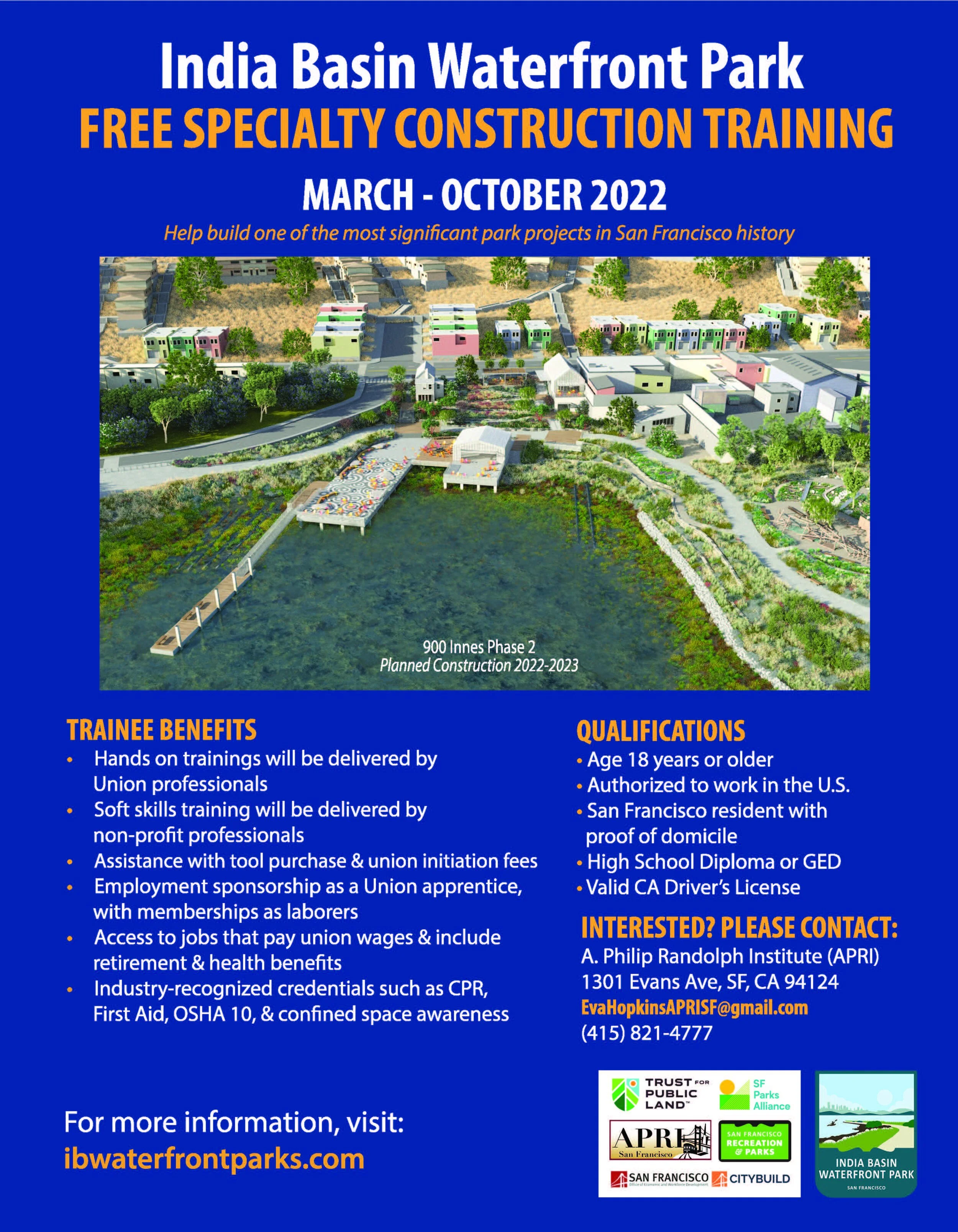 Orientations have begun as a part of the recruiting process for the India Basin Waterfront Park specialty construction training. These free trainings, in partnership with the San Francisco Office of Economic and Workforce Development (OEWD) and its CityBuild Academy, will be delivered by union professionals with other benefits such as tool and union initiation assistance, employment sponsorship as a union apprentice with members as laborers. Orientations will run through May.