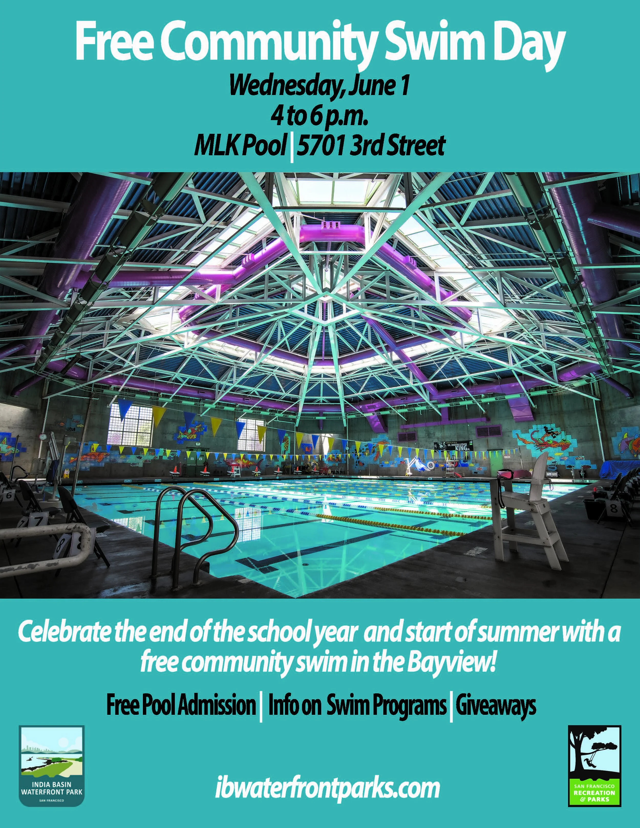 As a part of the India Basin Waterfront Park Project and its Equitable Development Plan, celebrate the end of the school year and start of summer with a FREE community swim day at Martin Luther King Jr. Pool (5701 3rd Street) on Wednesday, June 1 from 4 to 6 p.m.! In addition to free swimming, there will be information on swimming programs for the summer and fall, as well as free giveaways to get your summer started. See you in the water!