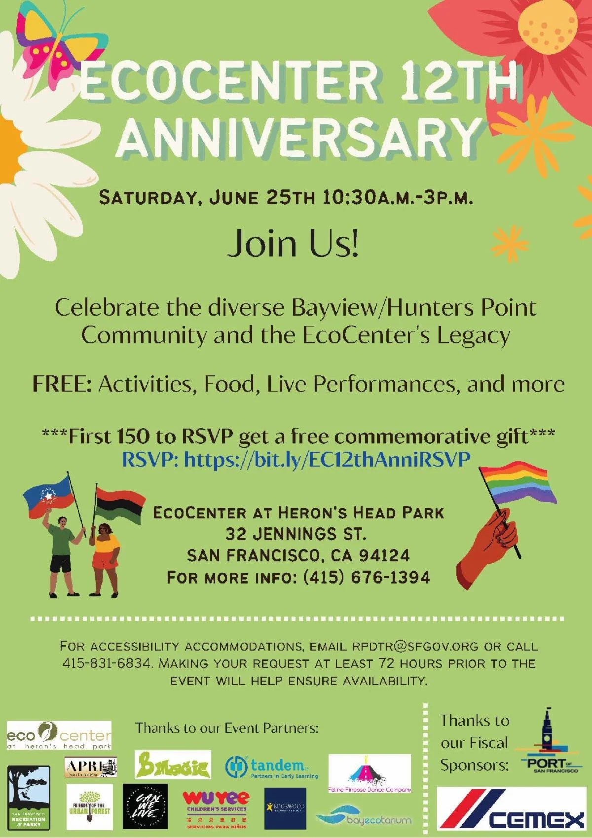 Join us and community partners for the EcoCenter's 12th Anniversary on Saturday, June 25 from 10:30 a.m. to 3 p.m. There will be food, activities, performances, and more. Additionally, the first 150 people to RSVP will get a free commemorative gift! Celebrate community and the legacy of the EcoCenter in Heron's Head Park. For more information and to register, click here: https://bit.ly/3O6nvUp