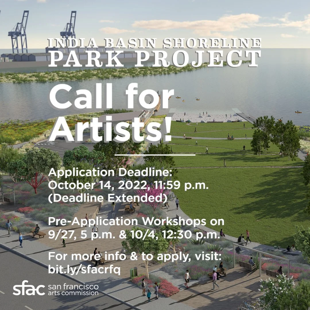 The San Francisco Arts Commission is looking for artists and artist teams to submit public art proposals for the India Basin Waterfront Park Project at India Basin Shoreline Park. Proposals for this public art opportunity may range from a single, large sculpture to a series of smaller, human-scale sculptures located along the walking paths through the current India Basin Shoreline Park site. Artwork should be inspired by and responsive to both the site and the proposed park design, including its natural habitats, physical landscape, site history, sustainability, and program. It should also be a point of discovery and have a cohesive narrative experience along trails of the park; serve as an asset for the community and expression of neighborhood identity; and provide a community benefit, which includes providing opportunities for artists with a meaningful connection to the Bayview-Hunters Point neighborhood in San Francisco.