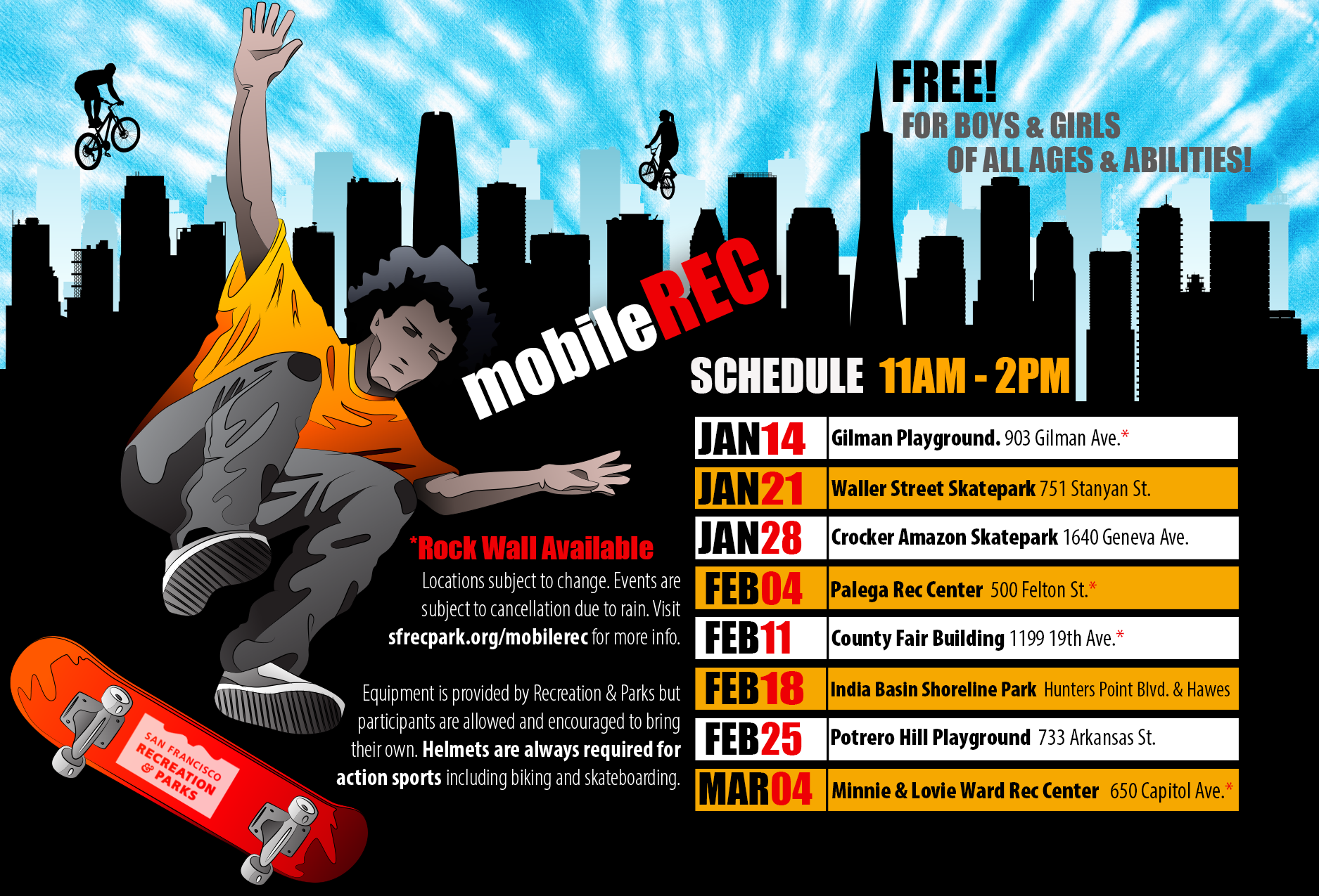 Mobile Rec heads to India Basin Shoreline Park (Hunters Point Boulevard and Hawes Street) on Saturday, February 18 from 11 a.m. to 2 p.m. Enjoy free BMX biking, skateboarding and more. Equipment will be provided. Grind rails and catch some air!