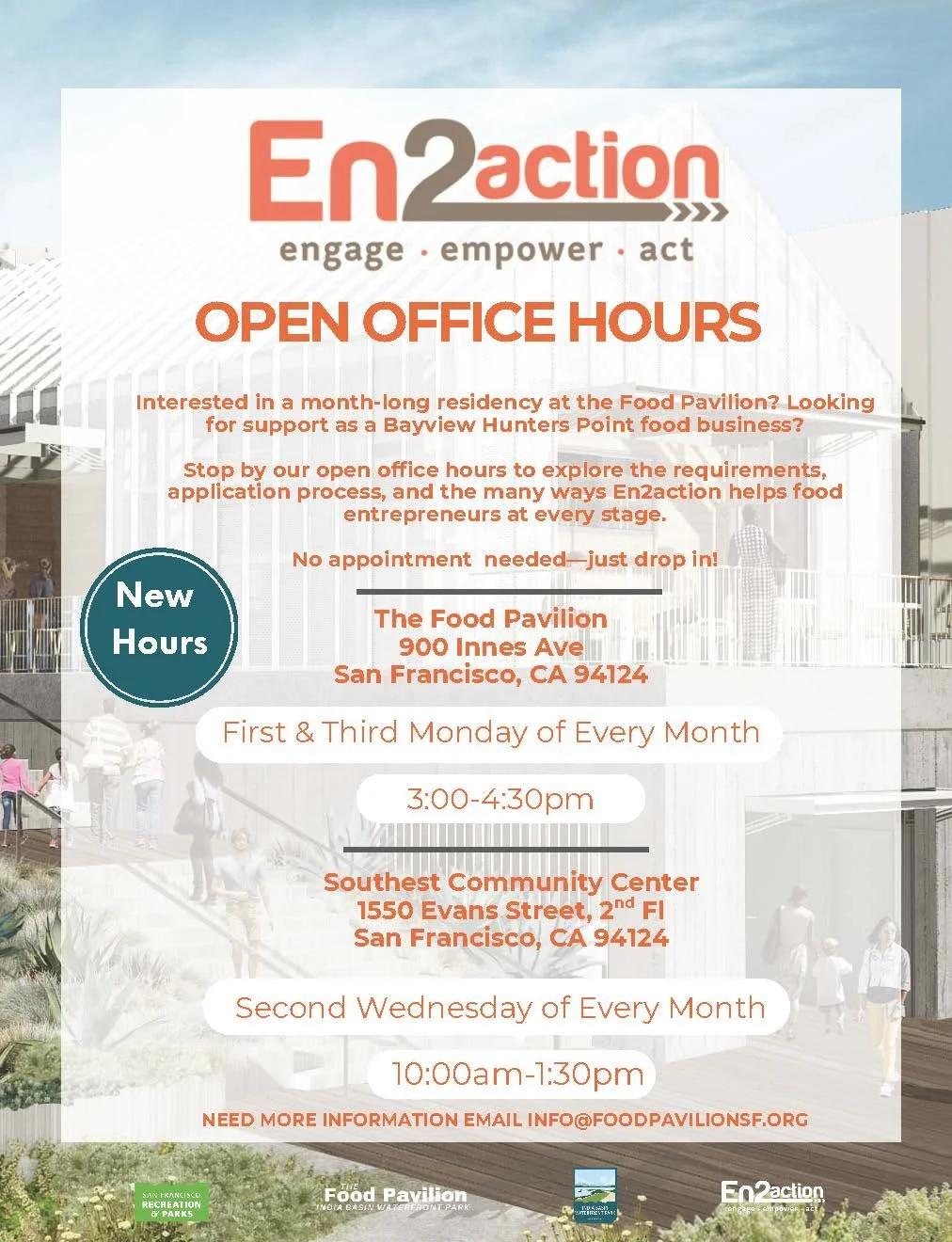 Interested in becoming a resident at the Food Pavilion (900 Innes Avenue)? Drop in for office hours, which take place every first and third Monday of the month from 3 to 4:30 p.m. at the Food Pavilion, as well as the second Wednesday of the month at the Southeast Community Center (1550 Evans Avenue) from 10 a.m. to 1:30 p.m. Learn about the application process, requirements, and how food entrepreneurs can be supported. Questions? Email info@thefoodpavilionsf.org.