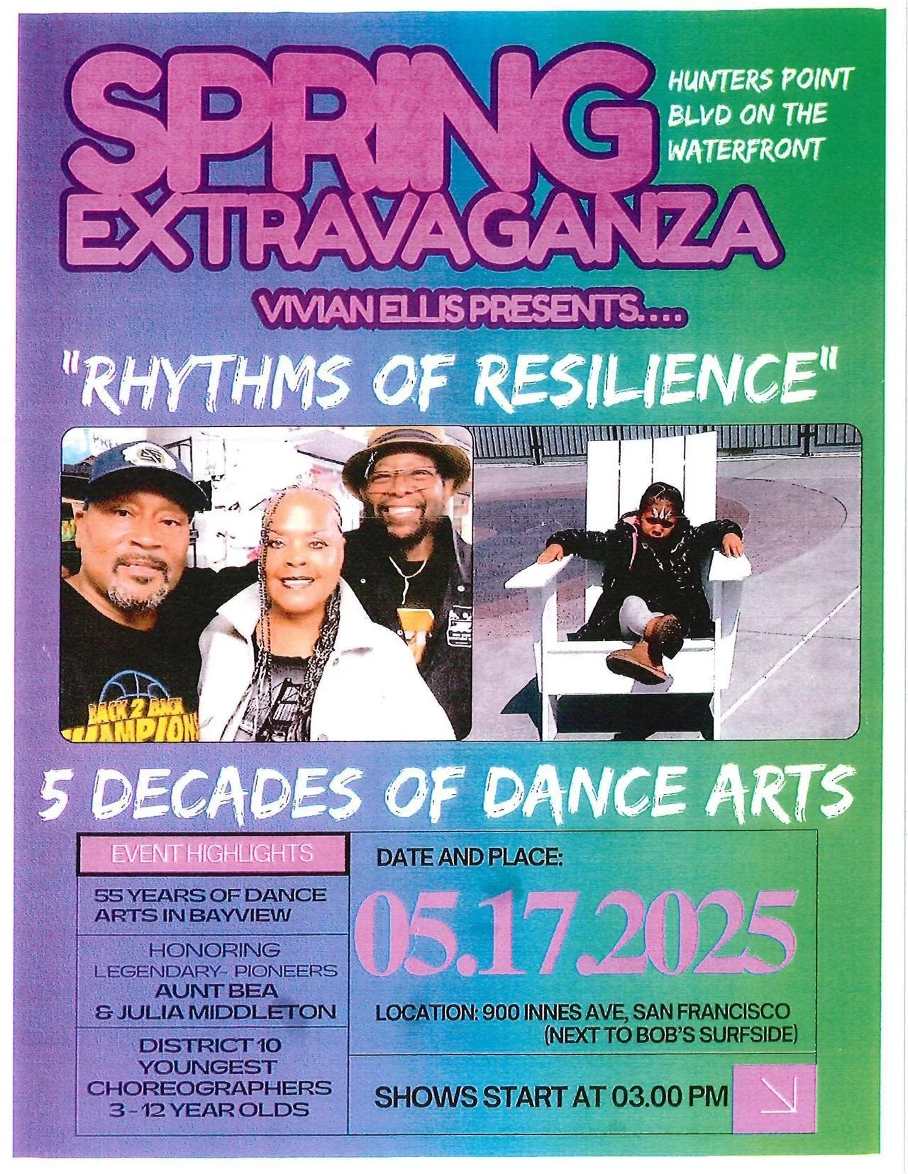 Bayview’s rich legacy of dance will take center stage at the Spring Extravaganza: Rhythms of Resilience, presented by Vivian Ellis. It will take place at India Basin Waterfront Park (900 Innes Avenue) on Saturday, May 17 beginning at 3 p.m. The event will feature tributes to local pioneers Aunt Bea and Julia Middleton, as well as performances by the youngest choreographers from District 10, ages 3 to 12. Come out for a day of community, culture and history!