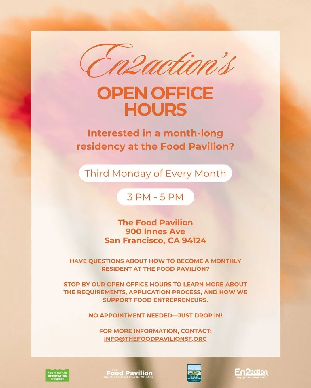 Curious about becoming a resident at the India Basin Waterfront Park Food Pavilion? Drop in for office hours with En2Action, which take place every third Monday of the month from 3 to 5 p.m. at the pavilion (900 Innes Avenue). Learn about the application process, requirements, and how food entrepreneurs can be supported. Questions? Email info@thefoodpavilionsf.org.