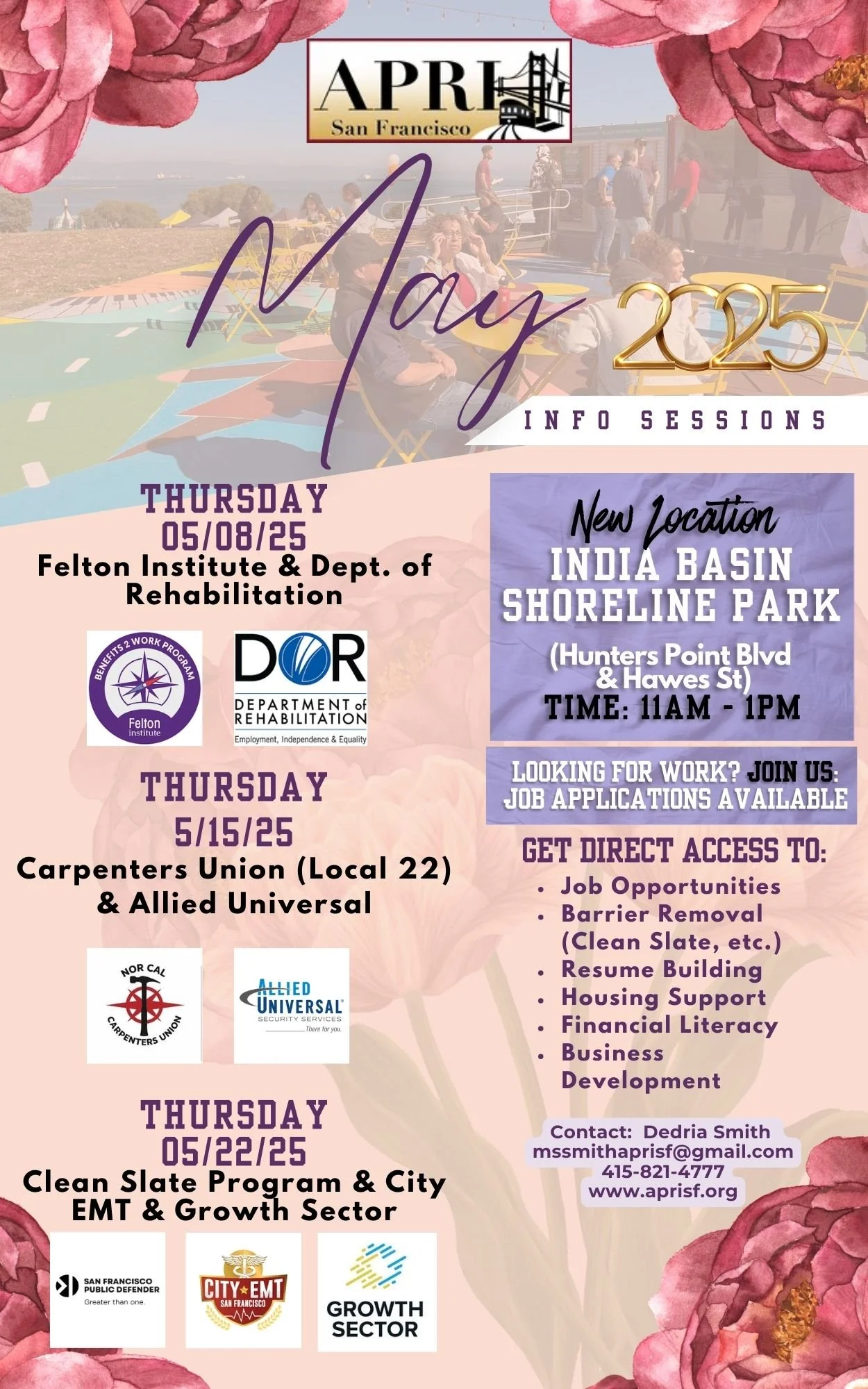 Come out for job information sessions with the A. Philip Randolph Institute (APRI) at the India Basin Shoreline Park (Hunters Point Boulevard and Hawes Street) Community Innovation Lab. Sessions take place on Thursdays from 11 a.m. to 1 p.m. with the Carpenters Union (Local 22) and Allied Universal at the lab on May 15. For more information, contact Dedria Smith at (415) 821-4777 or at mssmithaprisf@gmail.com.