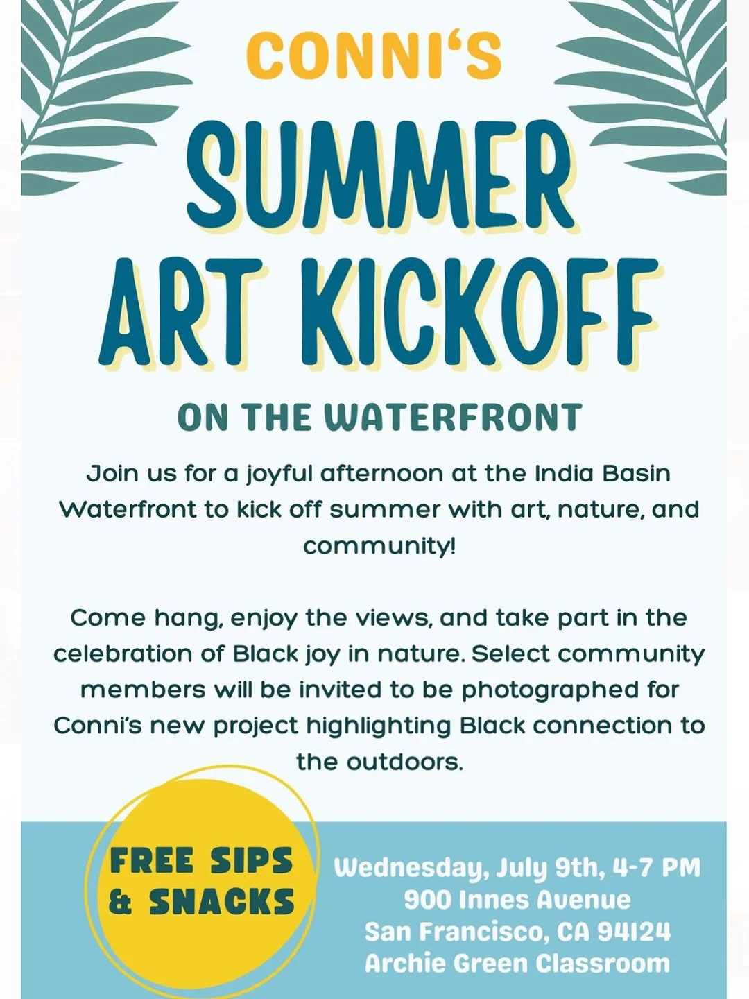 Join Conni’s Summer Art Kickoff on the Waterfront for a joyful afternoon of art, nature and community at the India Basin Waterfront Park (900 Innes Avenue). The event, taking place Wednesday, July 9 from 4 to 7 p.m., will feature free sips and snacks, scenic views, and a celebration of Black joy in nature. Select attendees may be invited to participate in Conni’s new art project, which highlights Black connection to the outdoors. The event will be held in the Archie Green Community Room.