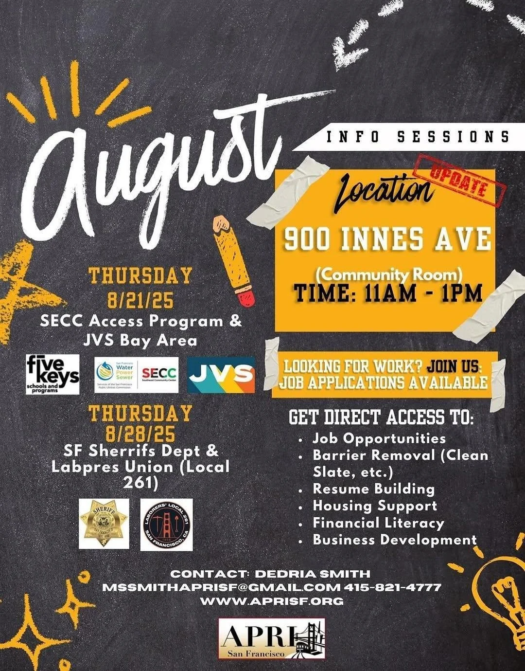 Come out for job information sessions with the A. Philip Randolph Institute (APRI), which will now take place at Shipwright's Cottage in the Archie Green Community Room at India Basin Waterfront Park (900 Innes Avenue). Sessions take place on Thursdays from 11 a.m. to 1 p.m. on August 28 with the San Francisco Sheriff's Office and the Laborers Union, Local 261. For more information, contact Dedria Smith at (415) 821-4777 or at mssmithaprisf@gmail.com.
