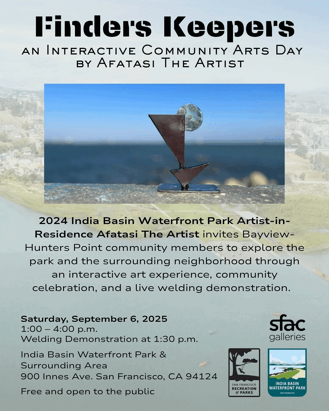 Afatasi the Artist will unveil her project at an event on Saturday, September 6 from 1 to 4 p.m. "Finders Keepers" is an interactive experience inviting BVHP residents to rediscover India Basin Waterfront Park (900 Innes Avenue) and the surrounding neighborhood in fresh, meaningful ways. The event will start at Shipwright's Cottage in the park and will feature local food, music, a scavenger hunt for hand-welded sculptures, and a live welding demo by the artist. Additional activities include jump houses, free haircuts, and an open shop with Rocking the Boat.