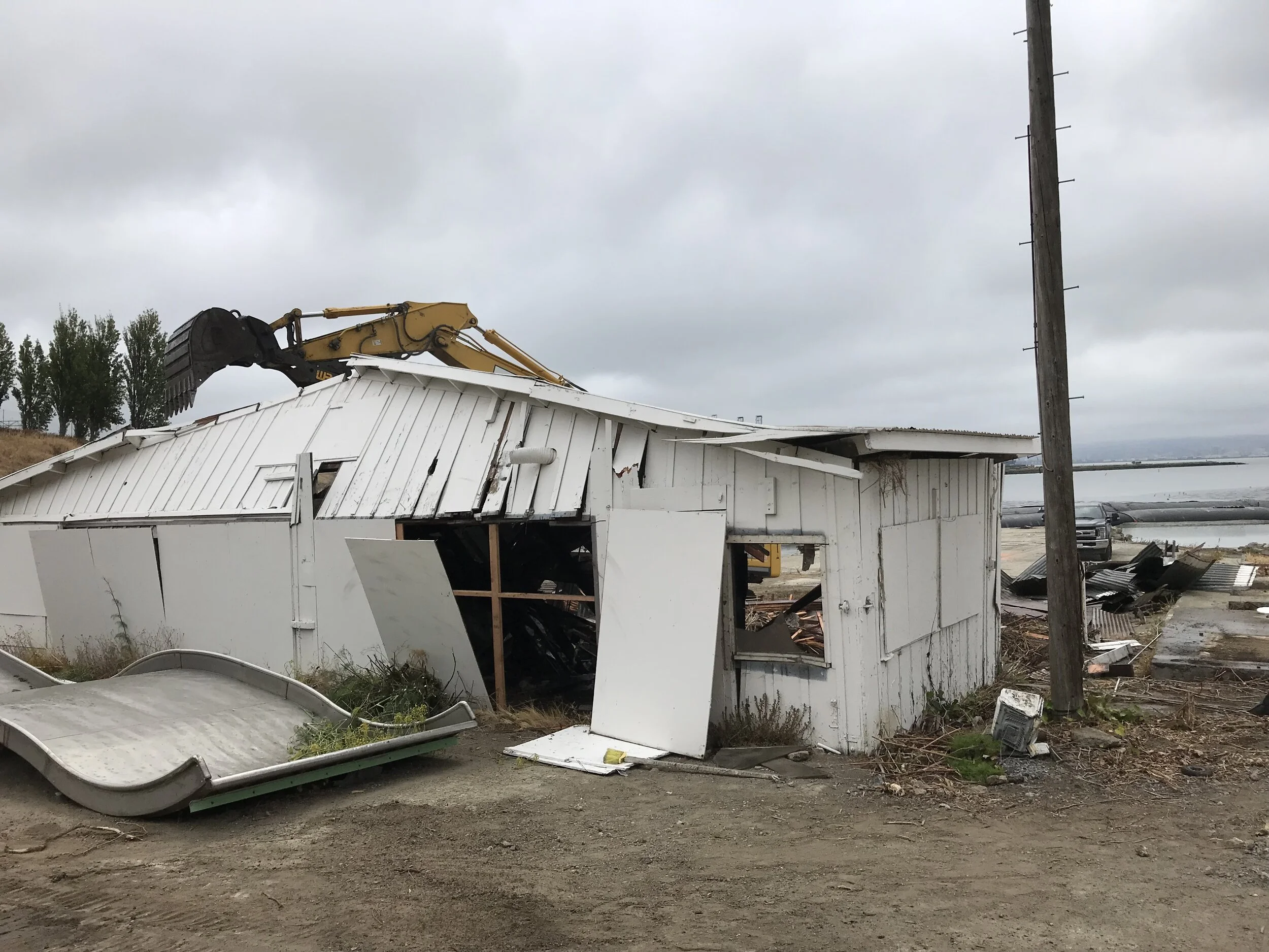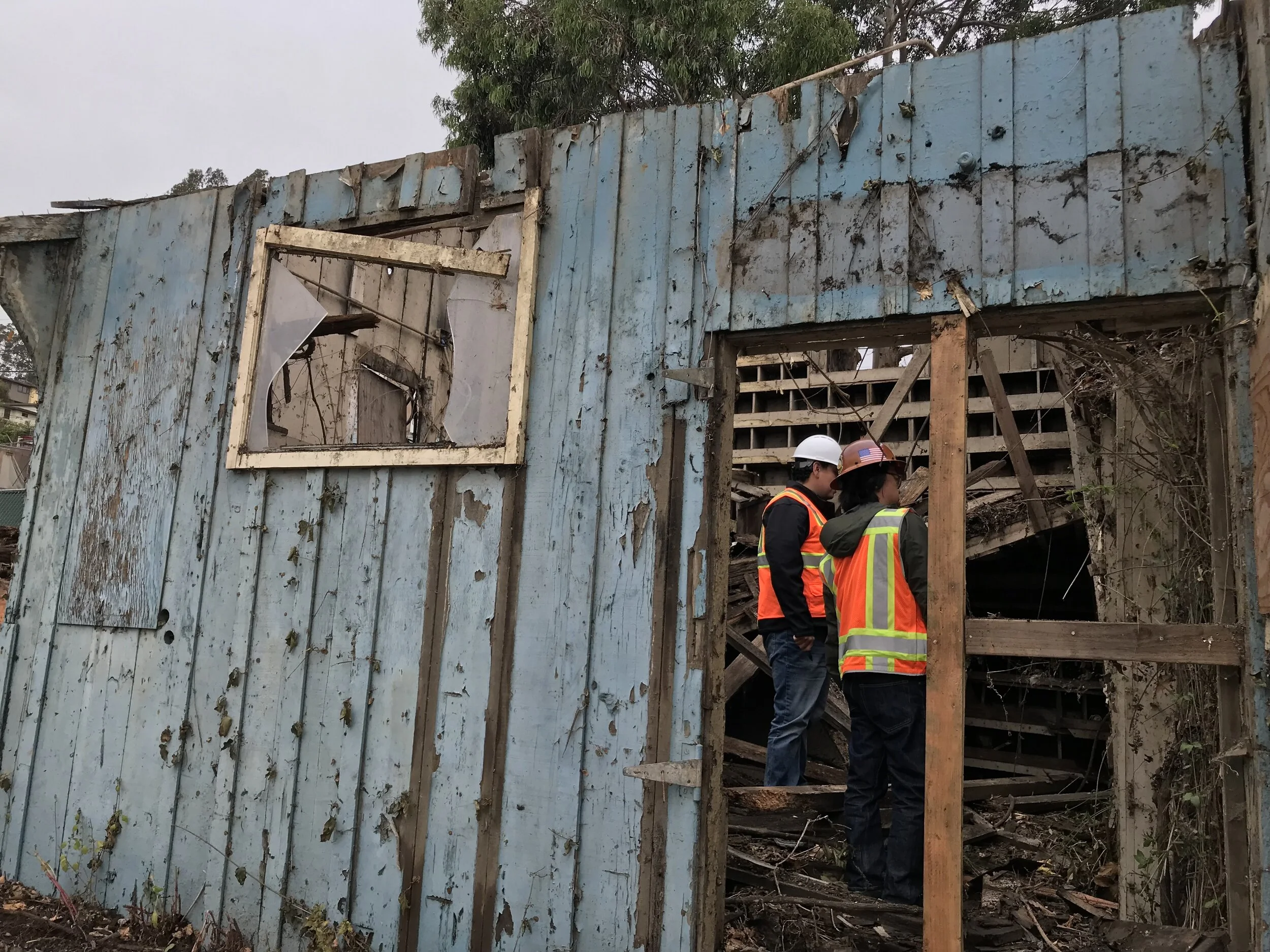 Work this week consisted of demolishing abndoned building structures to get the site ready for future development. The team is working to salvage artifacts from the Tool Shed such as storage cubbies, siding, signage where not compromised by wet rot or burnt from previous fires. We look forward to seeing how these are incorporated by GGN Ltd in the future park design.