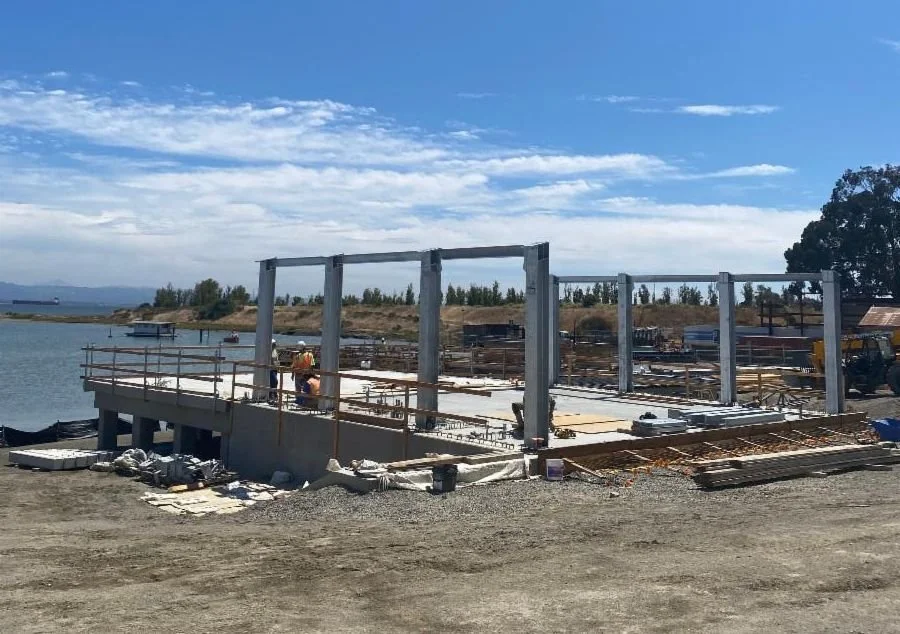 More features are rising from the shore at 900 Innes, as we placed the main eight structural columns at the Shop Building! Additionally, we formed the slab for the Food Pavilion, with waterproofing work and utility installation upcoming. We also completed excavation and have began installing marine rails.